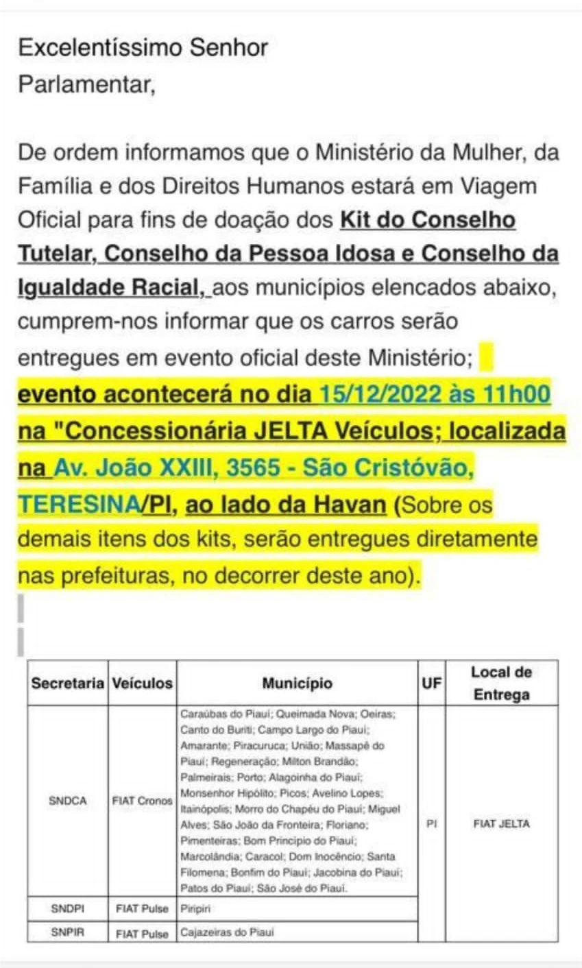A cerimônia de entrega do veículo, um modelo –  Fiat Cronos 0km, está marcada para acontecer na manhã de hoje, às 11 horas, na concessionária JELTA veículos – Cidade de Teresina, por meio do Ministério da Mulher, da Família e dos Direitos Humanos.