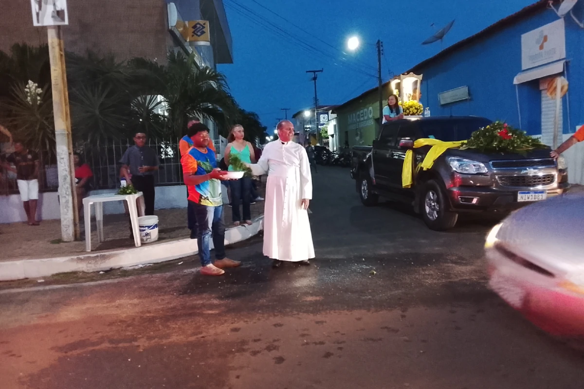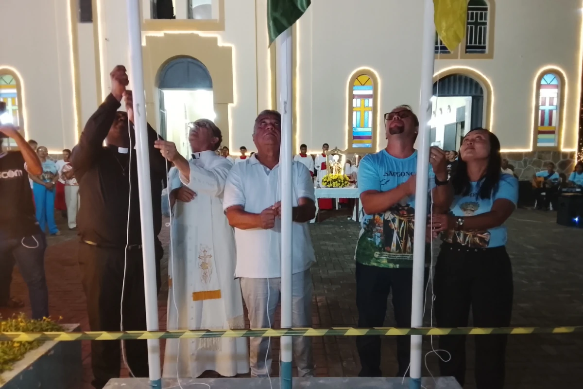 Na chegada ao centro da cidade, o padre Francimilson posicionou-se em frente à matriz para agradecer e abençoar todos os veículos participantes. Logo após, ocorreu o hasteamento das bandeiras da paróquia, da cidade e da Diocese de Teresina, marcando oficialmente a abertura dos festejos.