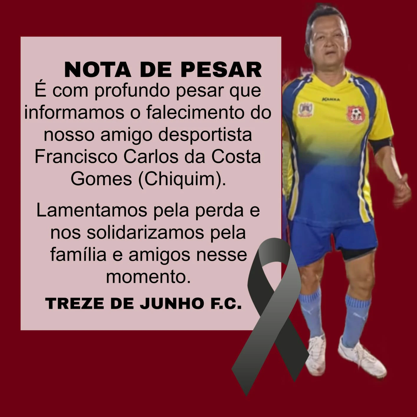Mais uma tragédia abalou o futebol amador do Médio Parnaíba na noite dessa quarta-feira, 10 de dezembro. O atleta Francisco Carlos da Costa Gomes, conhecido como Chiquinho, de 53 anos, natural de Água Branca-PI, faleceu após sofrer um infarto fulminante durante uma partida válida pelo Campeonato Society Cinquentão da cidade de Amarante.